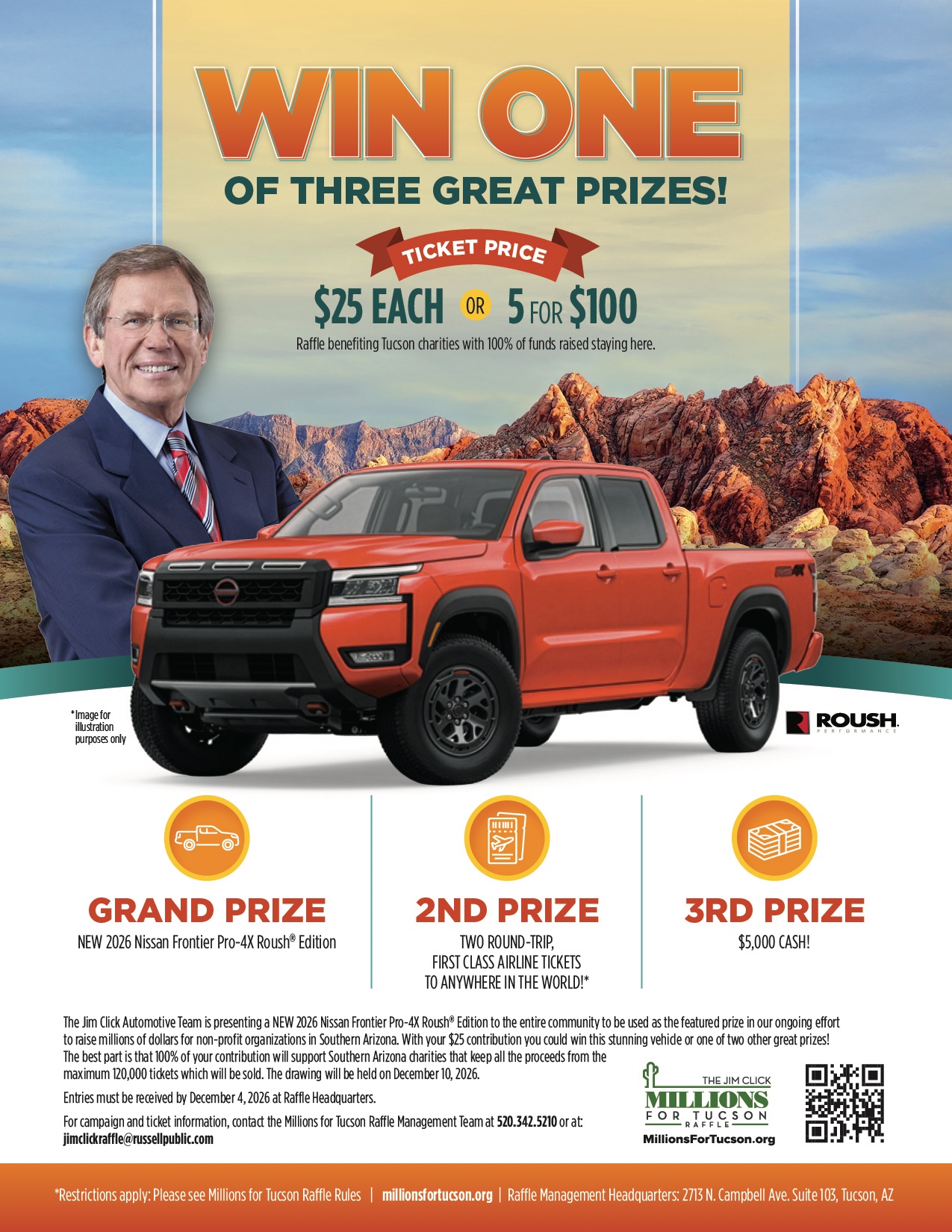 The grand prize is a 2026 Nissan Frontier Pro-4X Roush® Edition (or cash option), second prize is two round-trip, first-class airline tickets to anywhere in the world (some restrictions apply), and the 3rd prize is $5,000 in cash.