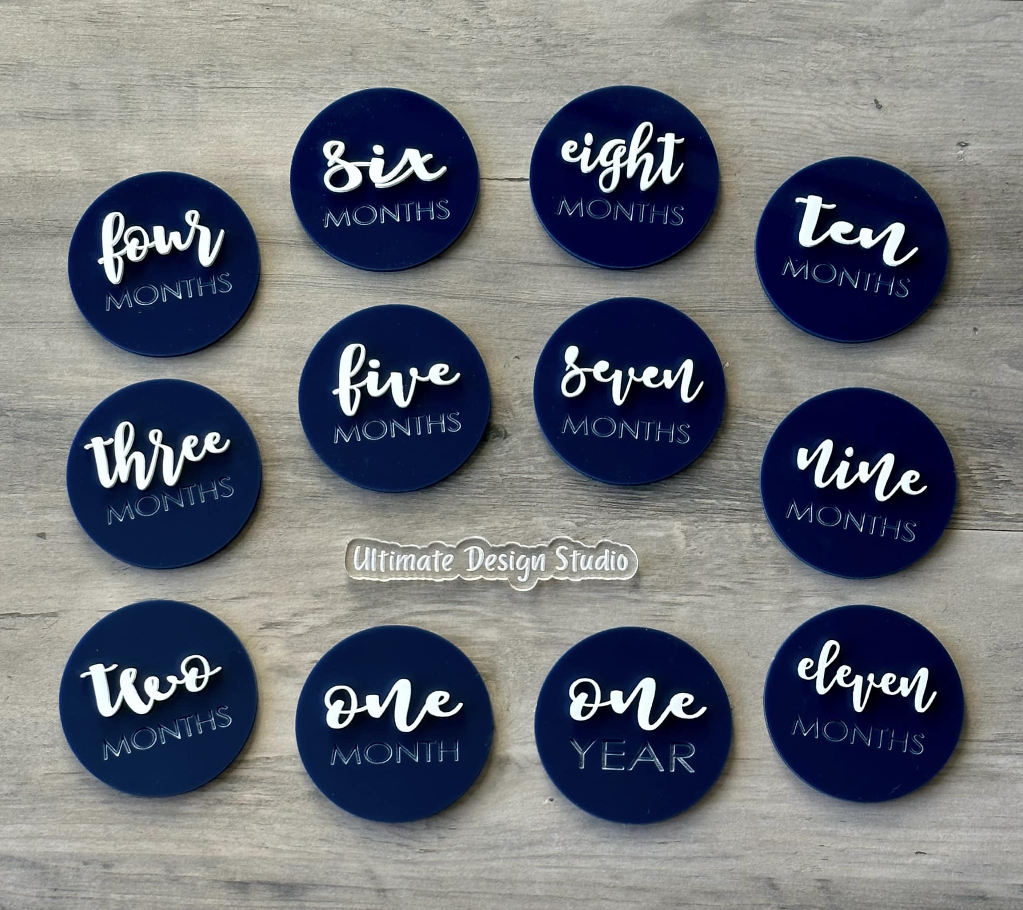 2.5” Round – 3D Number/Engraved Month, 3” Round – 3D Number/Engraved Month, 4” Round – 3D Number/Engraved Month, 2.5" Round – 3D Number & Month (all acrylic), 3" Round – 3D Number & Month (all acrylic), 4" Round – 3D Number & Month (all acrylic)